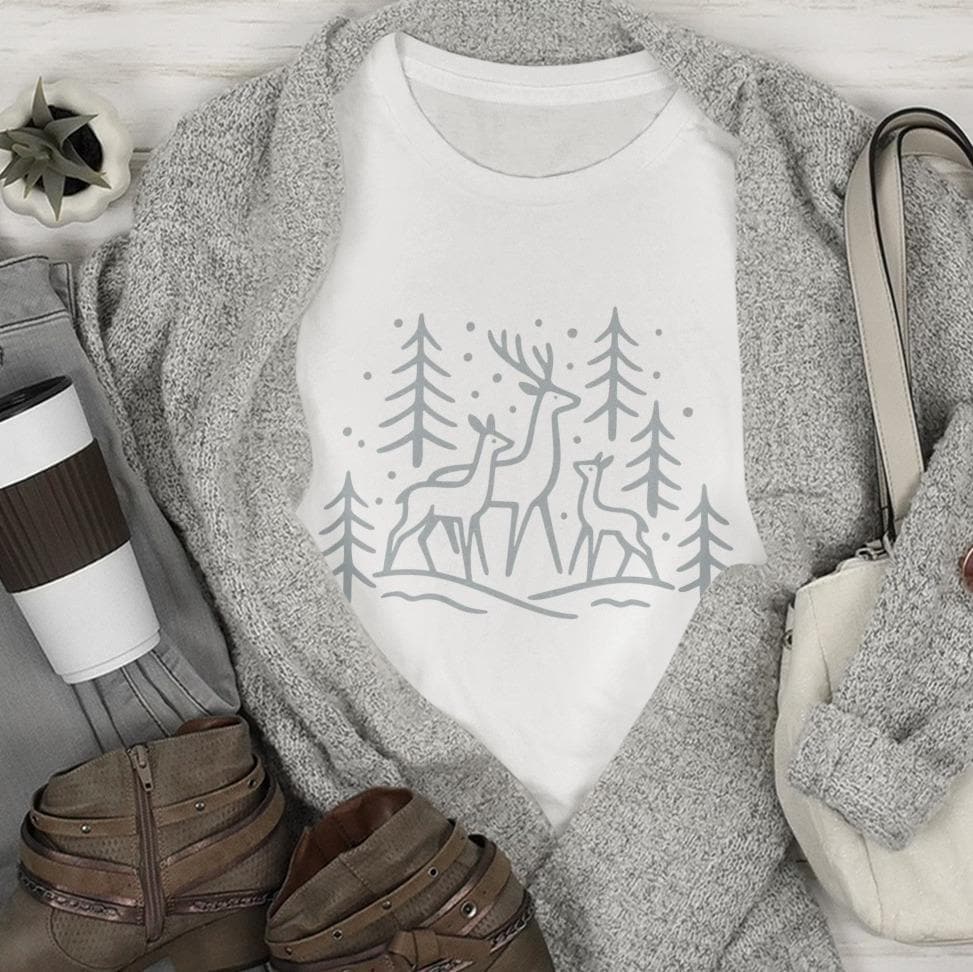 This Scandinavian winter plotter file in minimalist Nordic style shows a tranquil winter motif with deer, fir trees and snow.
